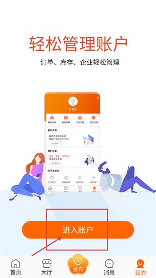 2、在【我的】界面,点击【进入账户】按钮,就能进入账户管理页面,对订单、库存、企业信息进行集中管理。