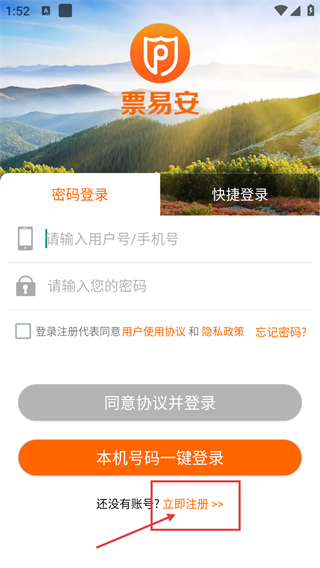 3、在【票易安】的登录界面,要是没有账号,可以点击【立即注册】,也可以选择【本机号码一键登录】等方式来完成账号登录。