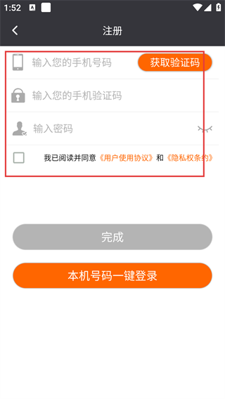 4、进入注册界面后,首先填写【输入您的手机号码】这一栏,接着点击【获取验证码】并将收到的验证码填入对应位置,随后设置账号密码,即可完成账号注册流程。