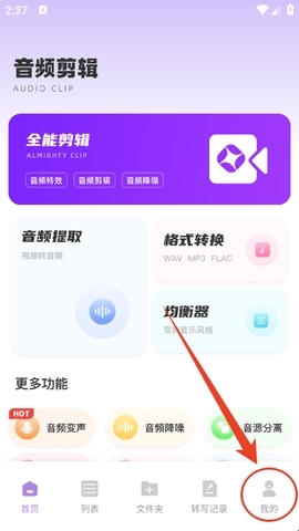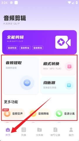 2、接着进入首页,界面如图所示,这里提供了音频剪辑相关的多种功能,包括提取、格式转换、变声、降噪、音源分离、合并、变速等。