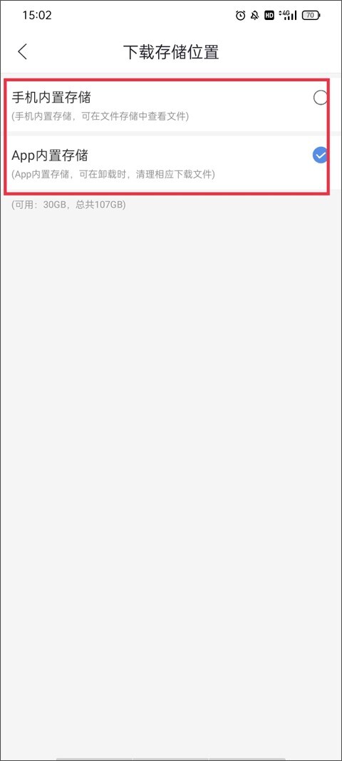 3、软件默认把内容存在存储空间里,要是想把优质的视频资源存到手机内存中,就可以选择切换为第一个选项:手机存储。