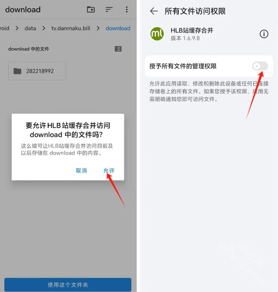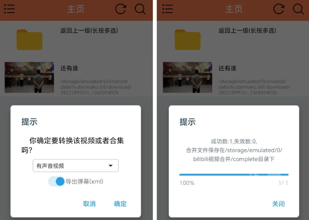 4.hlb站缓存合并工具获取权限后,在主页能看到缓存视频,点击该视频会弹出转换提示。系统默认转换的是带声音的视频,若需要弹幕,可选择导出弹幕选项。点击确定按钮后,仅需几秒就能完成识别、合并与转换操作,随后会弹出转换成功的页面。