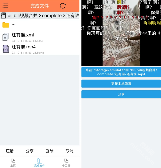 5. 转换完成后,complete文件夹里会出现mp4格式的视频文件和xml格式的弹幕文件。打开视频时,弹幕会自动加载出来,观看体验和在B站客户端上是一样的。