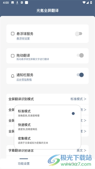 3、点击全屏翻译识别模式,该模式提供标准、快速、密集三种选项供选择。