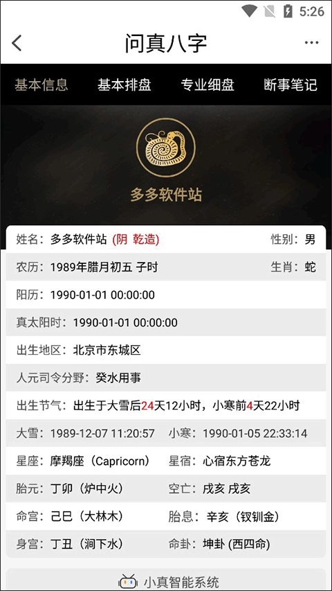 3、点击基本信息,即可查看详细的个人命理数据,其中包含生肖、节气、命宫等扩展信息。