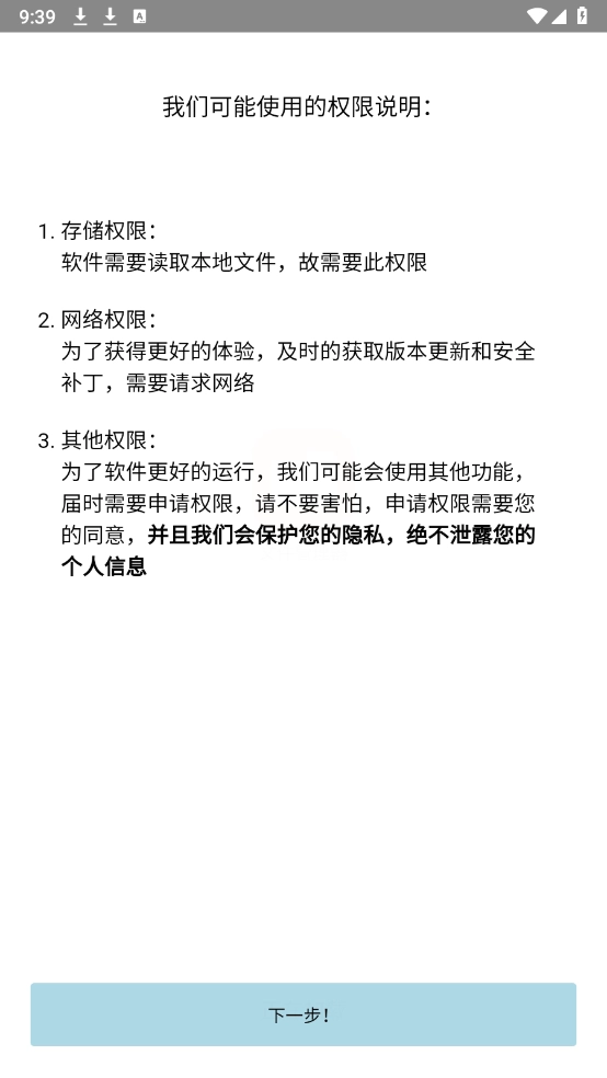 2、需要获取相关的权限以及阅读并同意隐私政策。