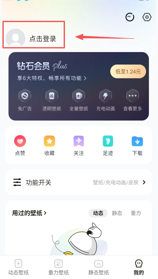 3、要使用完整功能,第一步需完成“点击登录”操作,登录后会展示会员特权相关信息,例如每天都能以低价使用所有壁纸。
