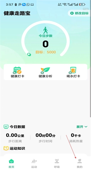 1、启动健康走路宝应用,进入主界面后,能看到今日步数显示为0,设定的运动目标是5000步,页面还包含健康打卡等功能模块,接着点击“我的”选项进入个人中心页面。
