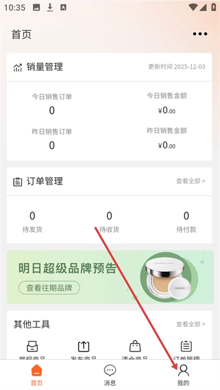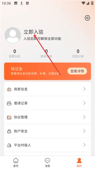 1、在首页点击底部的【我的】选项,就能进入个人中心页面,在这里可以查看入驻、结算等相关功能的入口。