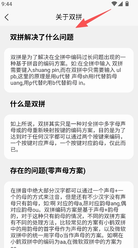 2、具备双拼知识学习功能,可查看双拼解决的问题、定义及零声母方案,帮助用户理解双拼原理,助力输入学习,实现知识的全面掌握。