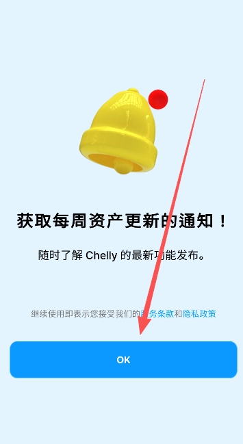 1、确认接收Chelly应用的最新通知,同时知晓完整的软件使用服务条款与隐私政策。