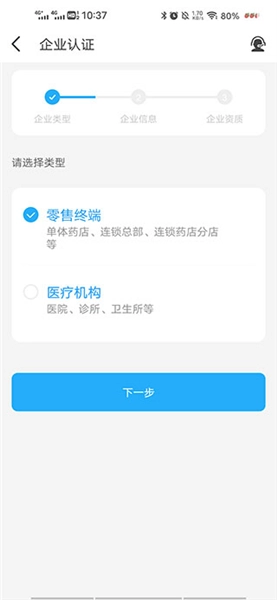 4、依据自身实际情况挑选类型,像零售终端、医疗机构这类,接着填写企业相关信息并完成企业资质认证,就能结束认证流程。