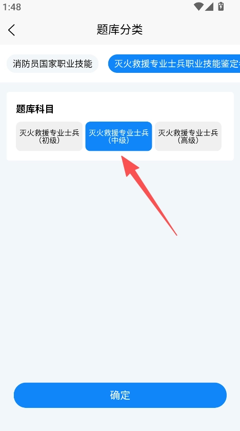 1、进入题库分类界面,挑选对应级别(例如灭火救援专业士兵中级),点击确认按钮。