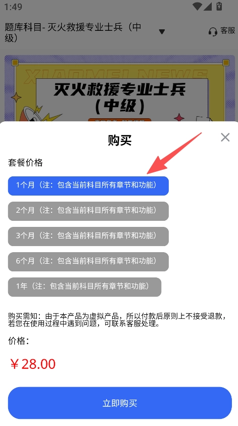 3、查看可选的购买套餐,挑选合适的时长(例如1个月),并详细了解配套的备考服务。