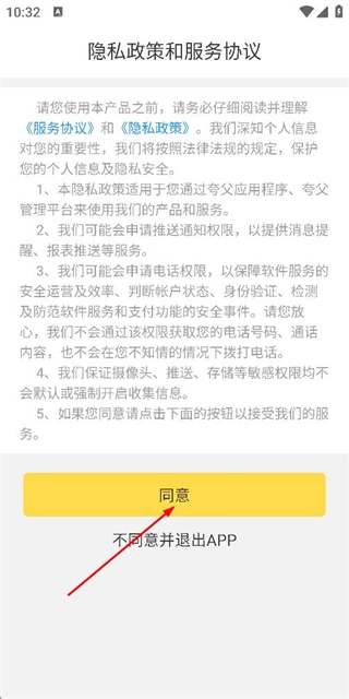 1、在隐私政策和服务协议页面点击同意按钮,进入登录页面。
