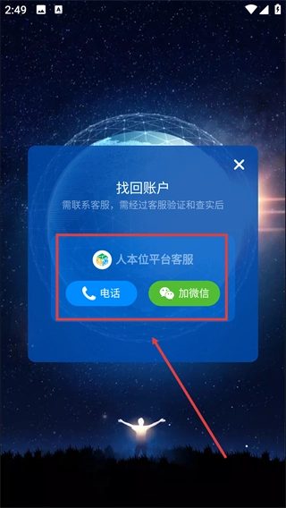 2、弹出的【找回账户】窗口中,显示需联系客服验证查实,可选择【电话】或【加微信】方式联系【人本位平台客服】来办理账户找回。