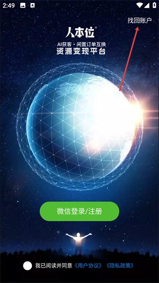 1、在平台登录界面,点击右上角的【找回账户】选项,可触发账户找回的操作弹窗。