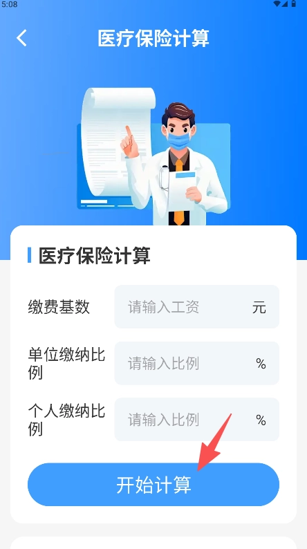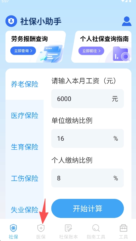 3、进入计算页面填写缴费基数与缴纳比例后点击底部“开始计算”按钮。