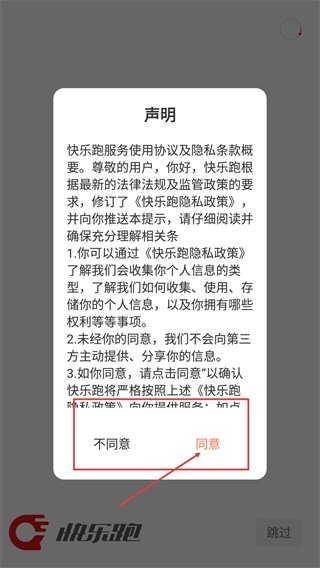 进入快乐跑应用后,会弹出包含《快乐跑隐私政策》的声明窗口,点击“同意”按钮即可继续使用软件的各项功能。