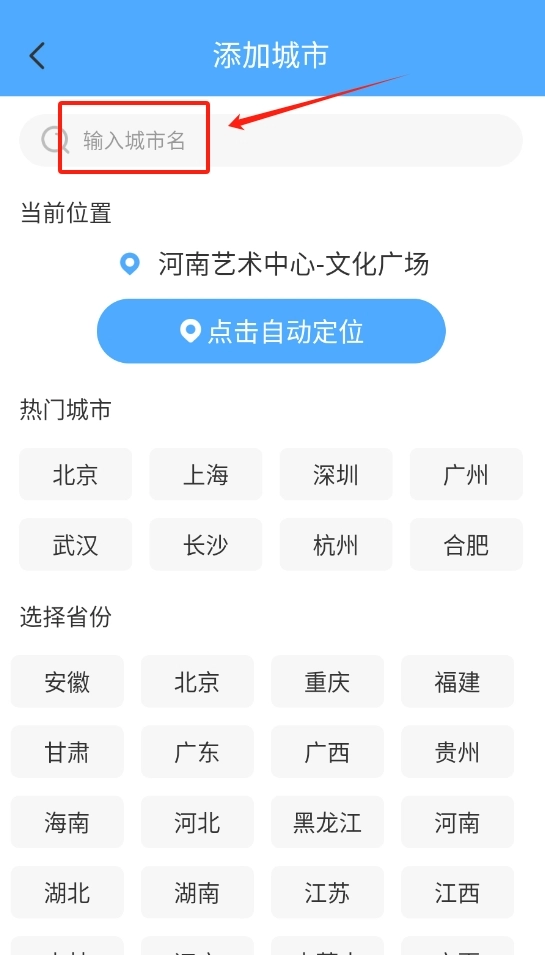 3、输入想添加的城市名即可添加。