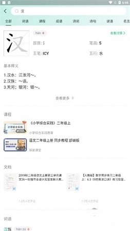 4、此时,我们就可以查看该字的详细信息了(包括拼音、笔顺、释义等),如果还想了解该字的组词情况,可以根据需求点击“词语”或“成语”进行查看。