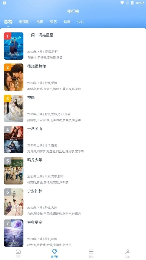 在排行榜页面,我们能看到电视剧、电影、综艺、动漫、少儿等各类影视热门榜单。
