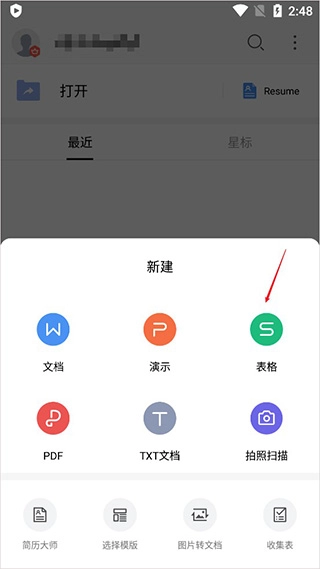 2、接着我们需要选择创建文件的类型,找到新建表格选项并点击;
