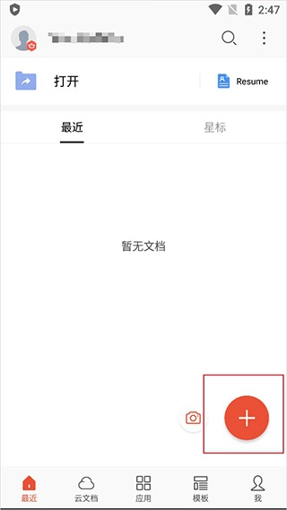1、打开WPS Office,在首页里点击右下角的+按钮;