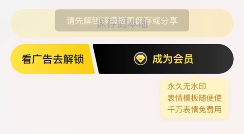 在闪萌表情里,大家可以制作自己喜欢的魔性表情,做好之后能把它分享到微信或QQ。不过要分享表情的话,得先【看广告解锁】,或者【成为会员】才行。