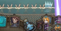 正常状态下,它的攻击方式主要有三种:一是发射子弹攻击玩家,造成伤害;二是召唤光球围绕自身,光球命中敌人时会造成伤害;三是召唤陨石砸落。当进入愤怒状态后,哥布林的攻击方式并未发生明显变化,只是部分技能的效果有所增强。