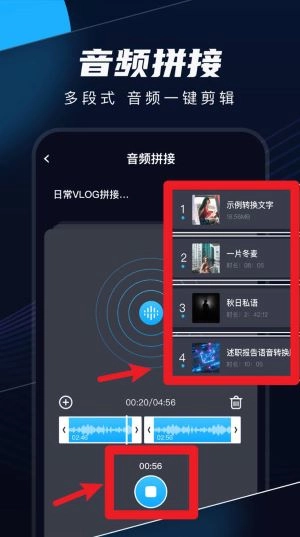 3、点击“音频拼接”功能,添加多个录音文件,依序排列后可自由调整顺序位置,一键合并生成完整音频文件。