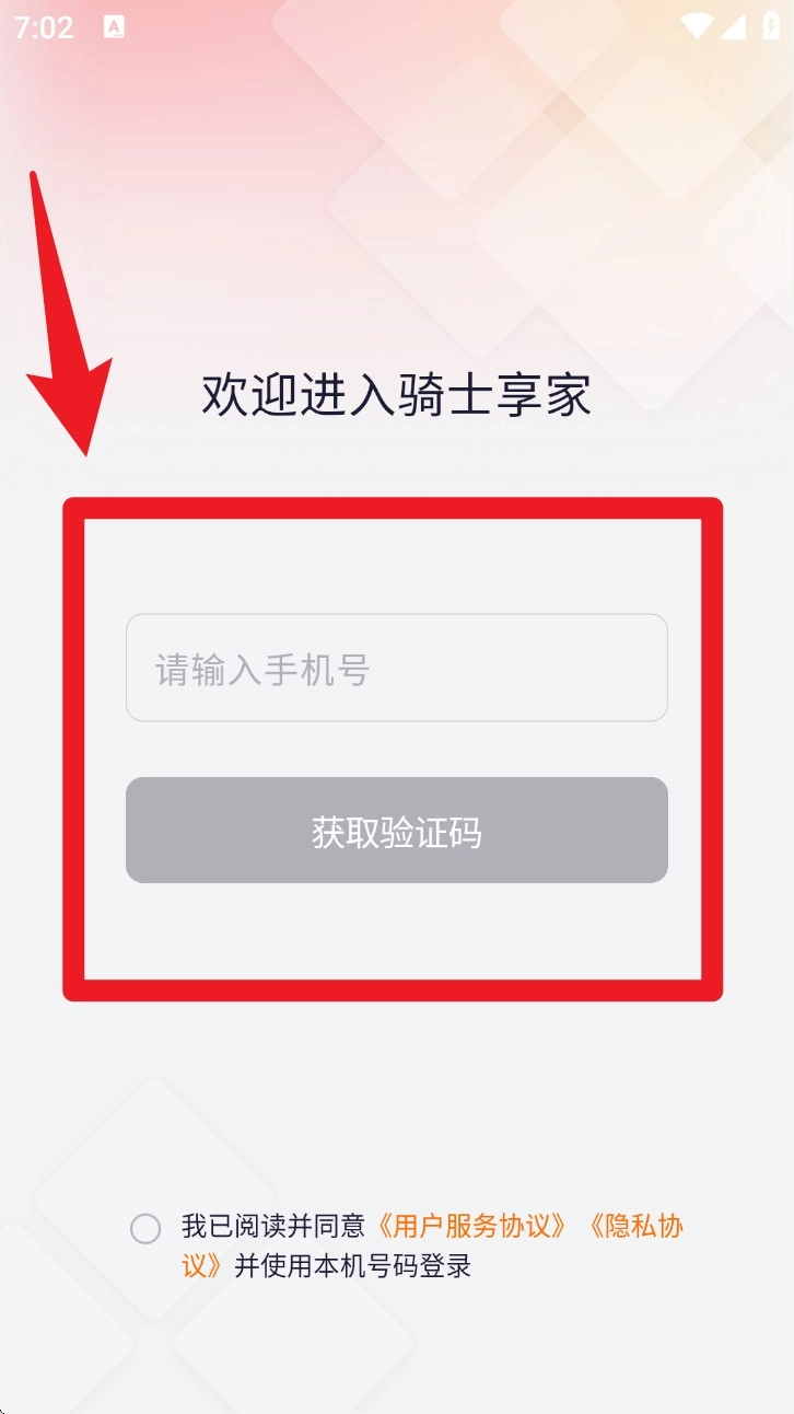1. 打开骑士享家App,在相应位置输入手机号,同时勾选下方协议,接着点击「获取验证码」,如此便能完成快捷登录,随后进入主页面进行操作。