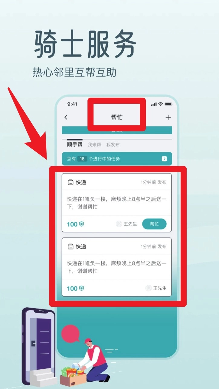 3. 若想参与邻里互助,可点击进入「骑士服务」,浏览他人发布的任务信息,挑选合适内容后,点击「帮忙」接单。