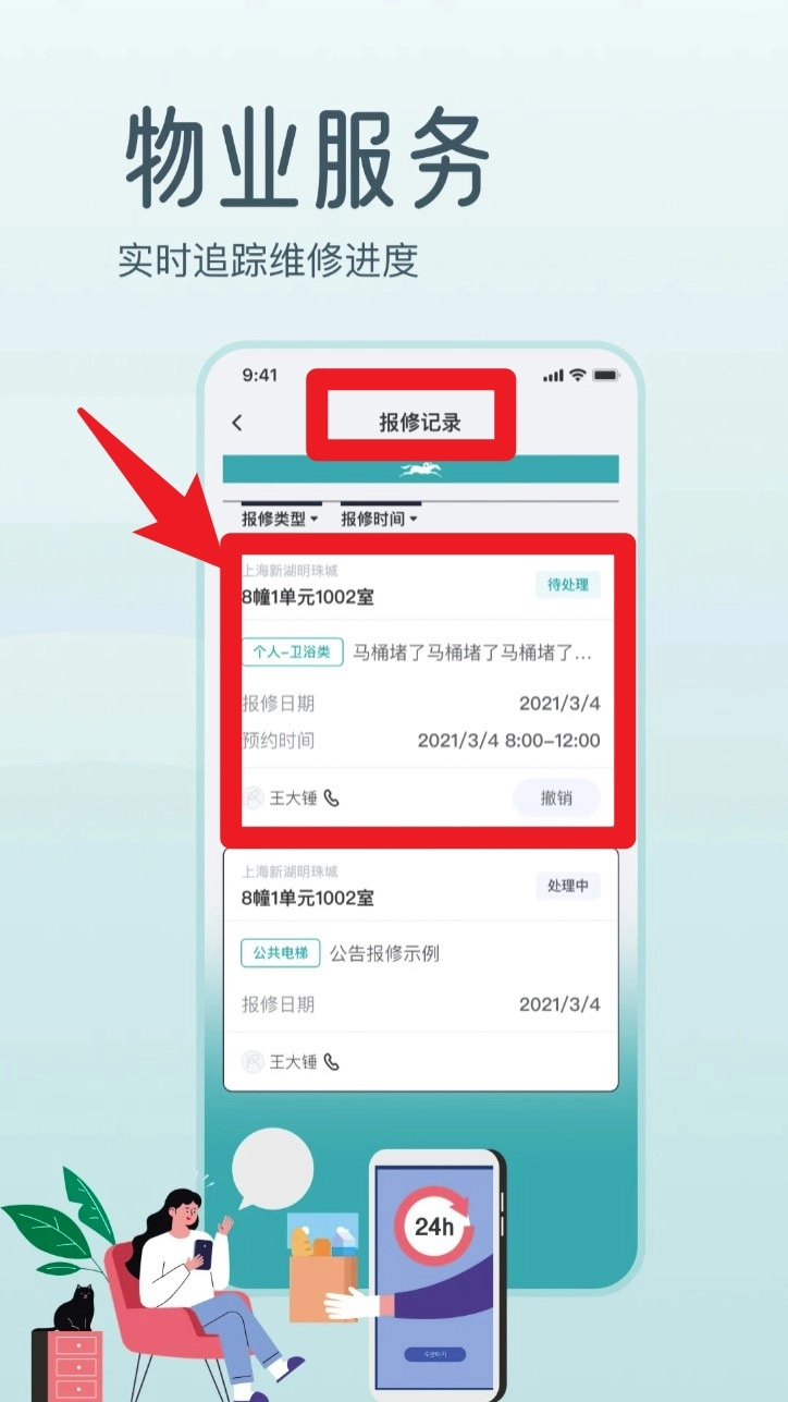 4. 若需报修社区设施,于「物业服务」处填写维修详细信息并提交,系统将生成处理记录,进度状态可随时查看。