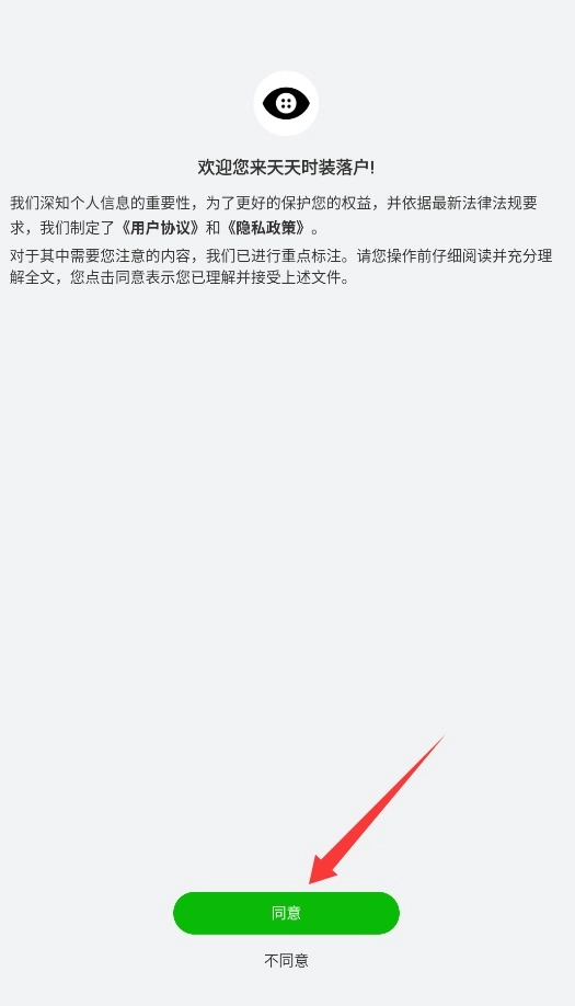 1. 首次使用天天时装APP,系统会呈现用户协议与隐私政策,认真阅读完毕后,点击同意按钮,即可进入注册页面。