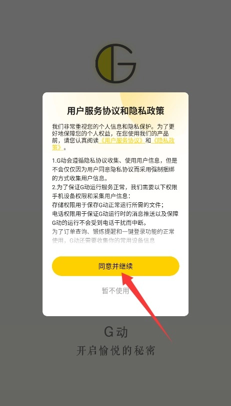 1. 首次使用时,需仔细通读平台服务条款与隐私政策,确认无误后,点击“同意并继续”进入应用。