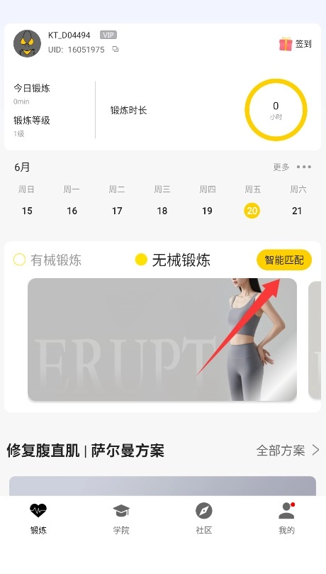 3、打开锻炼界面,系统会根据你的需求推荐器械或徒手训练方案,点击即可开始智能跟练。