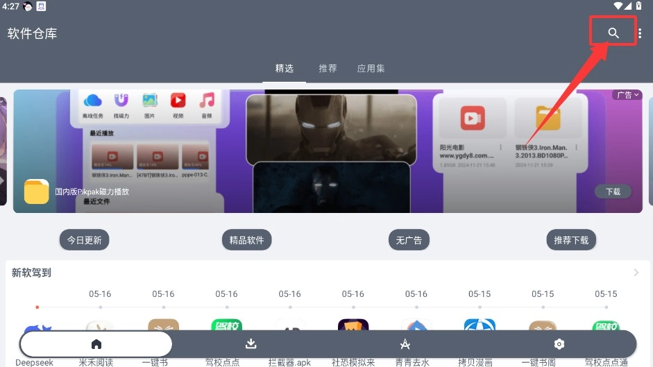 1、打开软仓APP进入主界面,在右上角的搜索框输入你想找的软件名称。