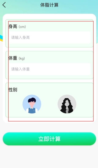 3、在体脂计算页面,输入身高和体重,选择性别后,点击【立即计算】按钮。