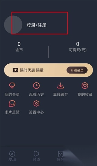 5、智能追剧:自动记录观看进度,用户能够从上次停止的地方继续观看。1、第一步,打开【我的】个人中心页面,点击如图所示的【登录/注册】按键。