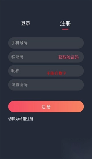 2、然后选择【注册】功能,输入手机号、昵称和密码(注意:昵称里面不能有数字)。