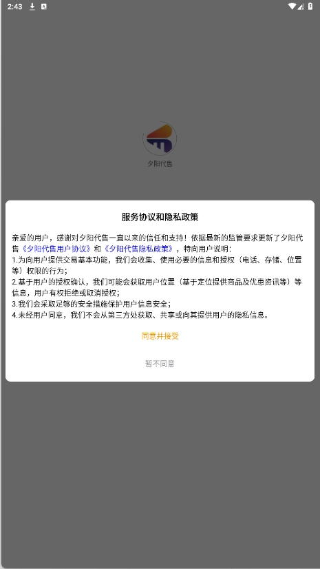 1. 首先下载夕阳代售app,下载完成后,仔细查看隐私政策与用户协议,并点击同意。