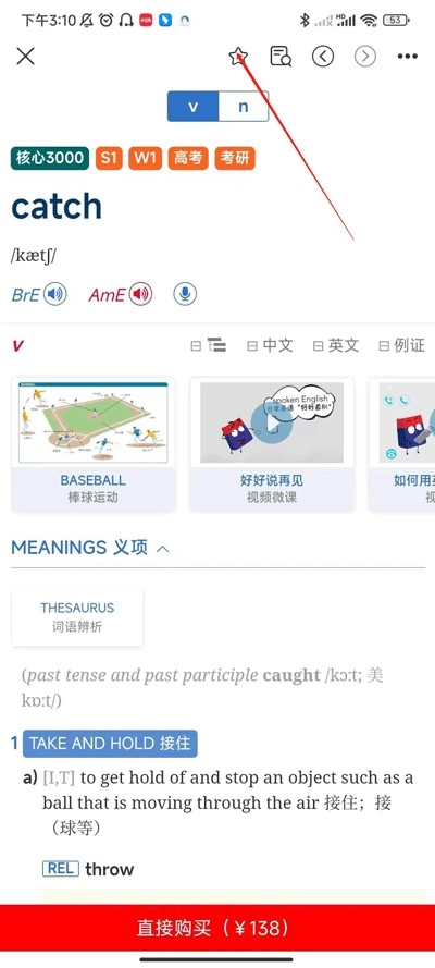 3、进入翻译界面,就能详细查看单词的音标、义项、例句以及使用频率。点击左上角的五角星按钮,还能把单词保存到生词本。(需登录账号才能使用保存功能)