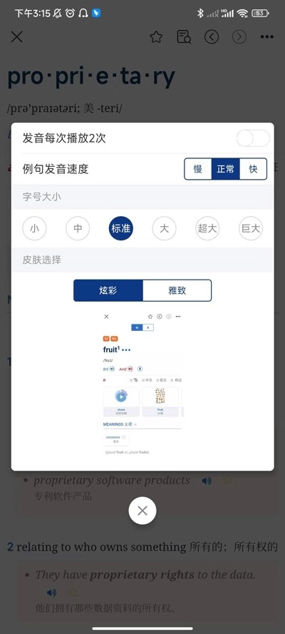 5、轻点右上角的三个点按钮,打开设置界面,在这里能够对发音速度、APP皮肤、字号大小等进行调整和设置。