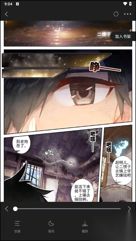 5、当我们轻轻触碰漫画的中间位置时,便能调出相应功能,其中涵盖目录、夜间模式、下载等。