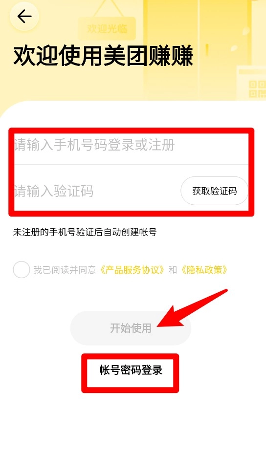 1. 输入手机号码并填写验证码,随后点击“开始使用”,就能完成登录或注册,同时也支持切换至账号密码登录模式。