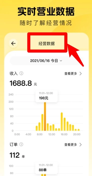 4、点击“经营数据”可查看当天收入订单详情,通过柱状图了解各时段运营状况。