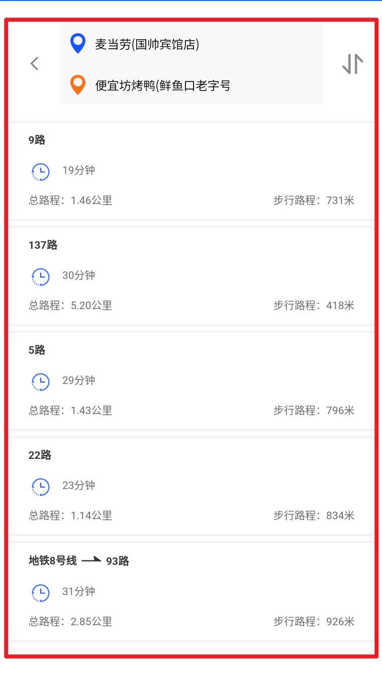 5. 根据路线推荐选择搭乘方案,结合步行路程一并参考,规划更省时更顺畅。