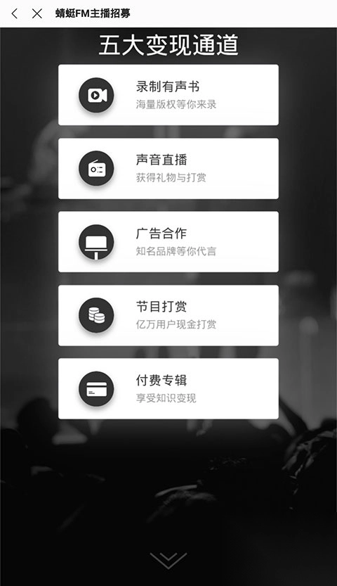 4、成为配音主播后,用户就可以通过录制有声书、声音直播、广告合作、节目打赏、付费专辑等渠道赚钱了。
