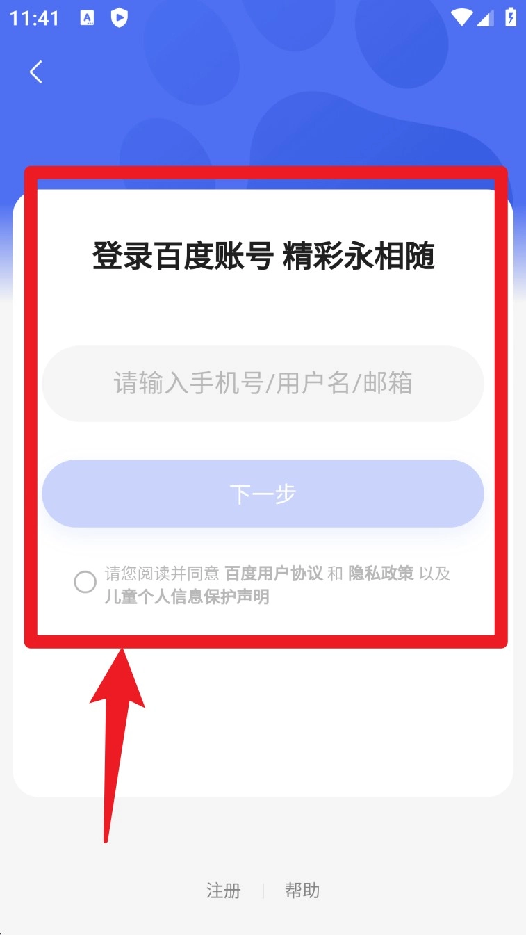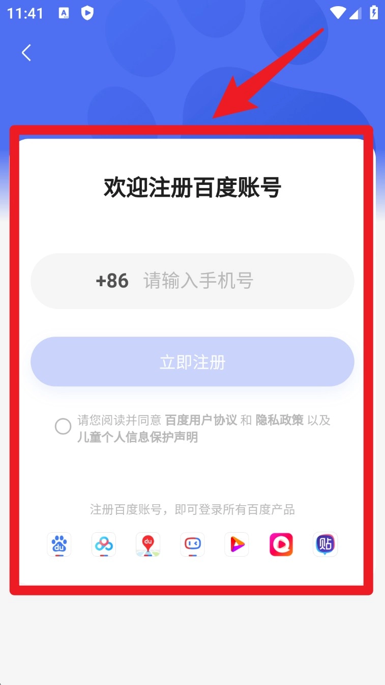 1. 打开App进入注册页面,输入手机号并勾选协议,点击「立即注册」创建百度账号。
